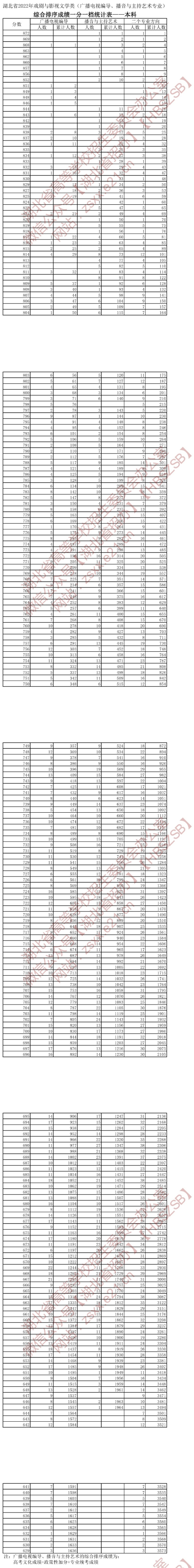 湖北省2022年戲劇與影視文學(xué)類(廣播電視編導(dǎo)、播音與主持藝術(shù)專業(yè))綜合排序成績(jī)一分一檔統(tǒng)計(jì)表(本科)