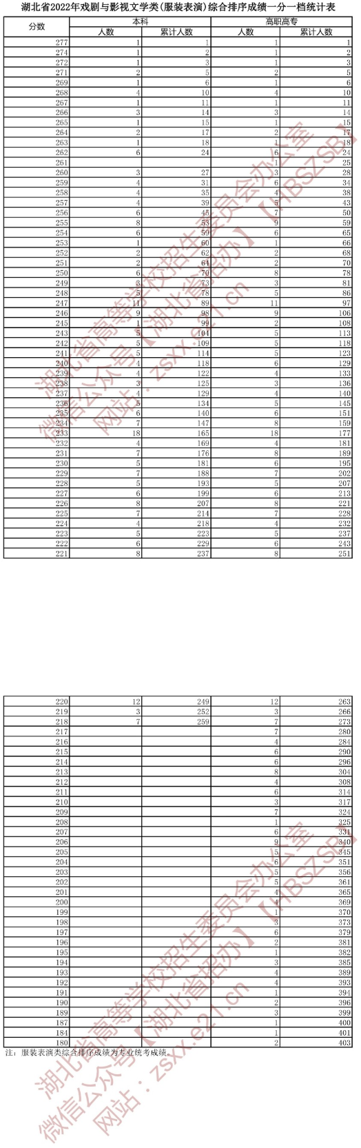 湖北省2022年戲劇與影視文學類(服裝表演專業(yè))綜合排序成績一分一檔統(tǒng)計表