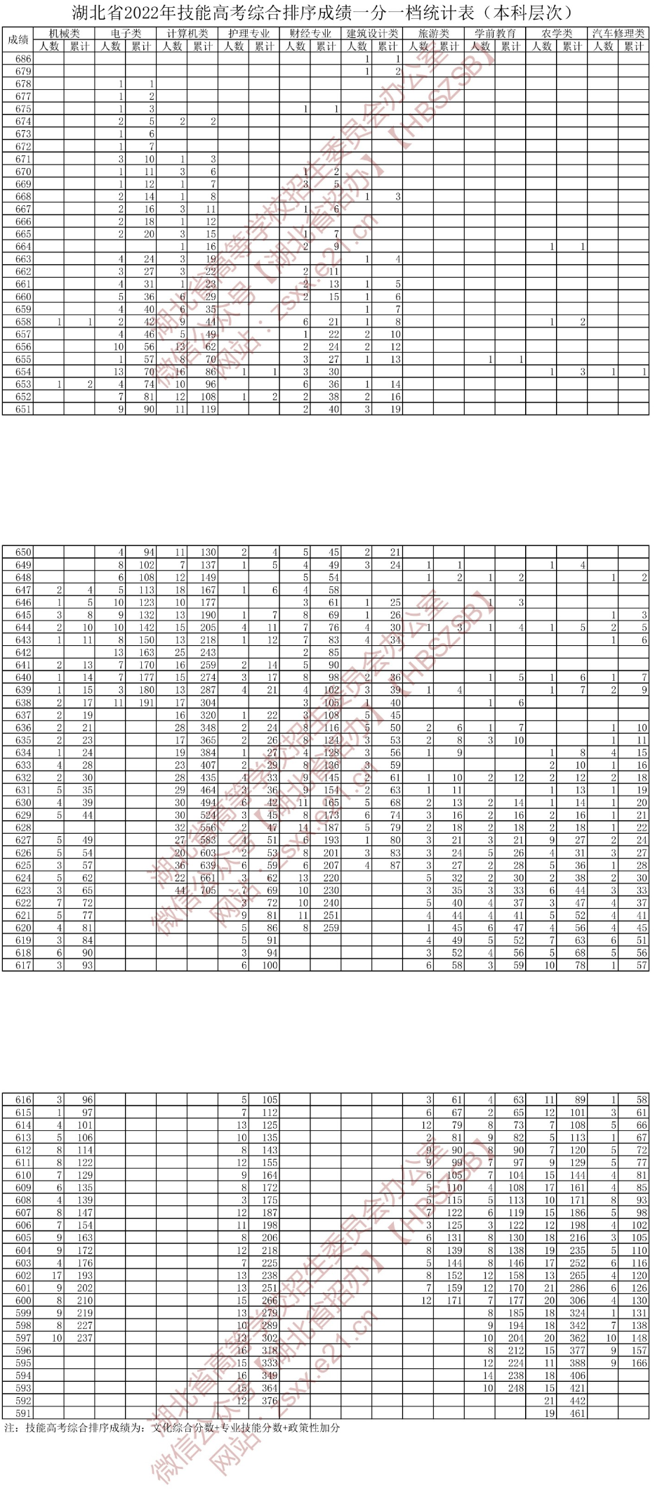 湖北省2022年技能高考綜合排序成績(jī)一分一檔統(tǒng)計(jì)表(本科層次)