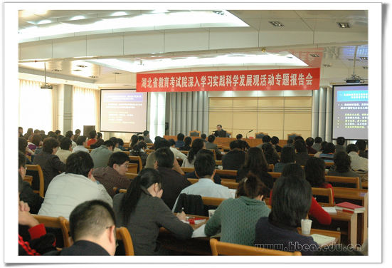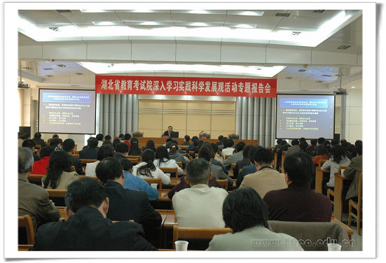 2008年10月28日下午,武漢大學(xué)黨委書記顧海良教授應(yīng)邀來我院作深入學(xué)習(xí)實踐科學(xué)發(fā)展觀活動專題報告。報告會由黨委書記、院長江暢主持,全院干部職工、《湖北招生考試》雜志社全體工作人員、其他院屬單位部門以上負(fù)責(zé)人共180多人聆聽報告。