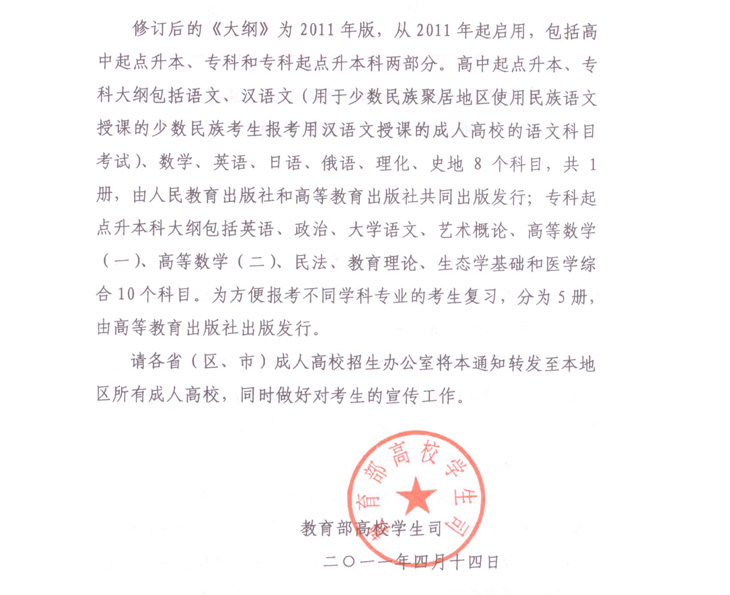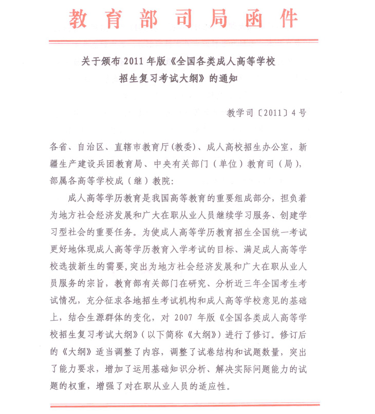 關(guān)于頒布2011年版《全國各類成人高等學(xué)校招生復(fù)習(xí)考試大綱》的通知