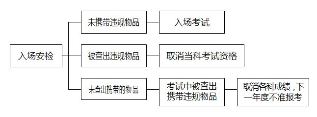 2.考生應(yīng)主動配合安檢。接受安檢前,應(yīng)按照監(jiān)考員的指令,主動將攜帶的違規(guī)物品放到考場專設(shè)的“考生物品存放處”。安檢過程中如有報警聲響起,應(yīng)出示相關(guān)物品并進行解釋。如因上廁所等特殊情況出考場后返回考場,應(yīng)再次接受安檢。