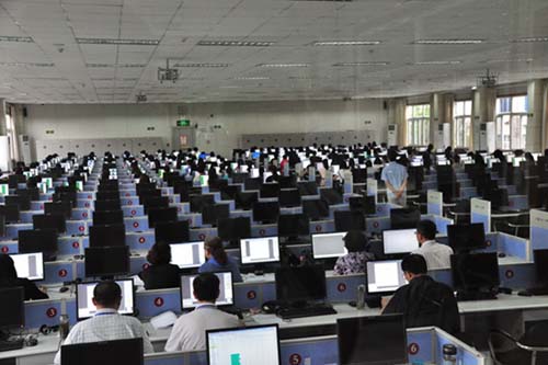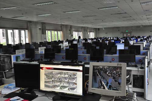 進入評卷點,須經(jīng)過2道安保檢查,來到評卷監(jiān)控室。透過監(jiān)控室兩側的落地透明玻璃,可以清楚看到當天有200多名評卷教師整齊坐在電腦屏幕前,專注著自己的屏幕,有條不紊地對掃描、切割、加密傳輸后的試題進行評閱。