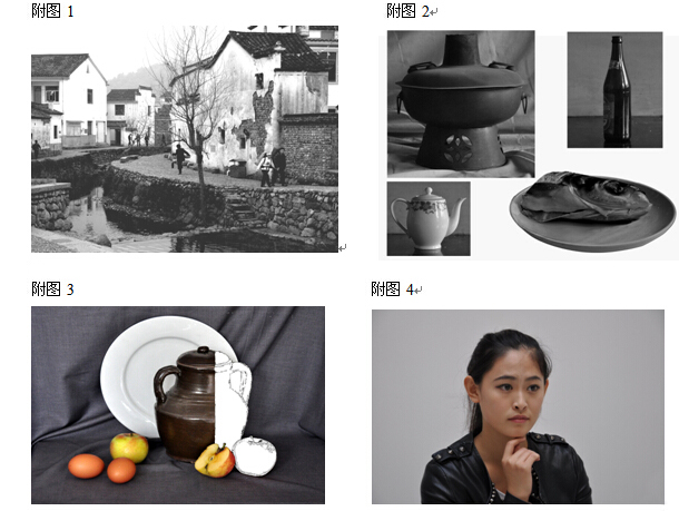 三、模擬寫生內(nèi)容:一個(gè)火鍋,一個(gè)茶壺,一個(gè)啤酒瓶,一個(gè)魚頭,一個(gè)瓷盤。(圖片小樣見附圖2)