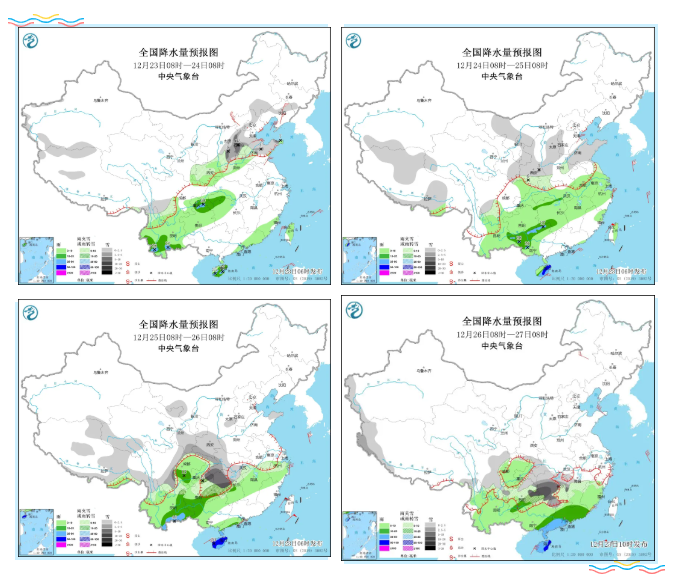 從目前預(yù)報(bào)看,23日至26日,華北中南部及其以南大部地區(qū)將有雨雪天氣。降雪較為明顯的地方有湖北西部山區(qū)、重慶東南部、貴州中東部、湖南中西部及太行山區(qū)、山東半島北部等地,部分地區(qū)將出現(xiàn)大雪,局地暴雪。另外,24日至26日,海南島有中到大雨、局地暴雨。