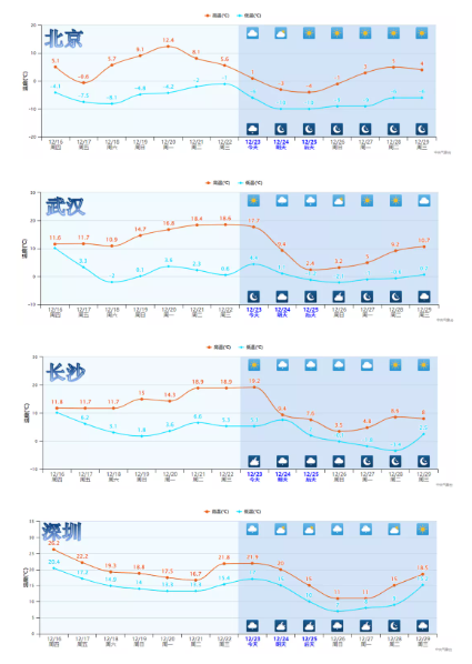 12月23日至26日,新一輪寒潮來襲,受其影響,我國(guó)中東部地區(qū)將出現(xiàn)大風(fēng)降溫以及雨雪天氣。冷空氣影響過后,中東部大部地區(qū)的氣溫都將創(chuàng)入冬以來的新低。