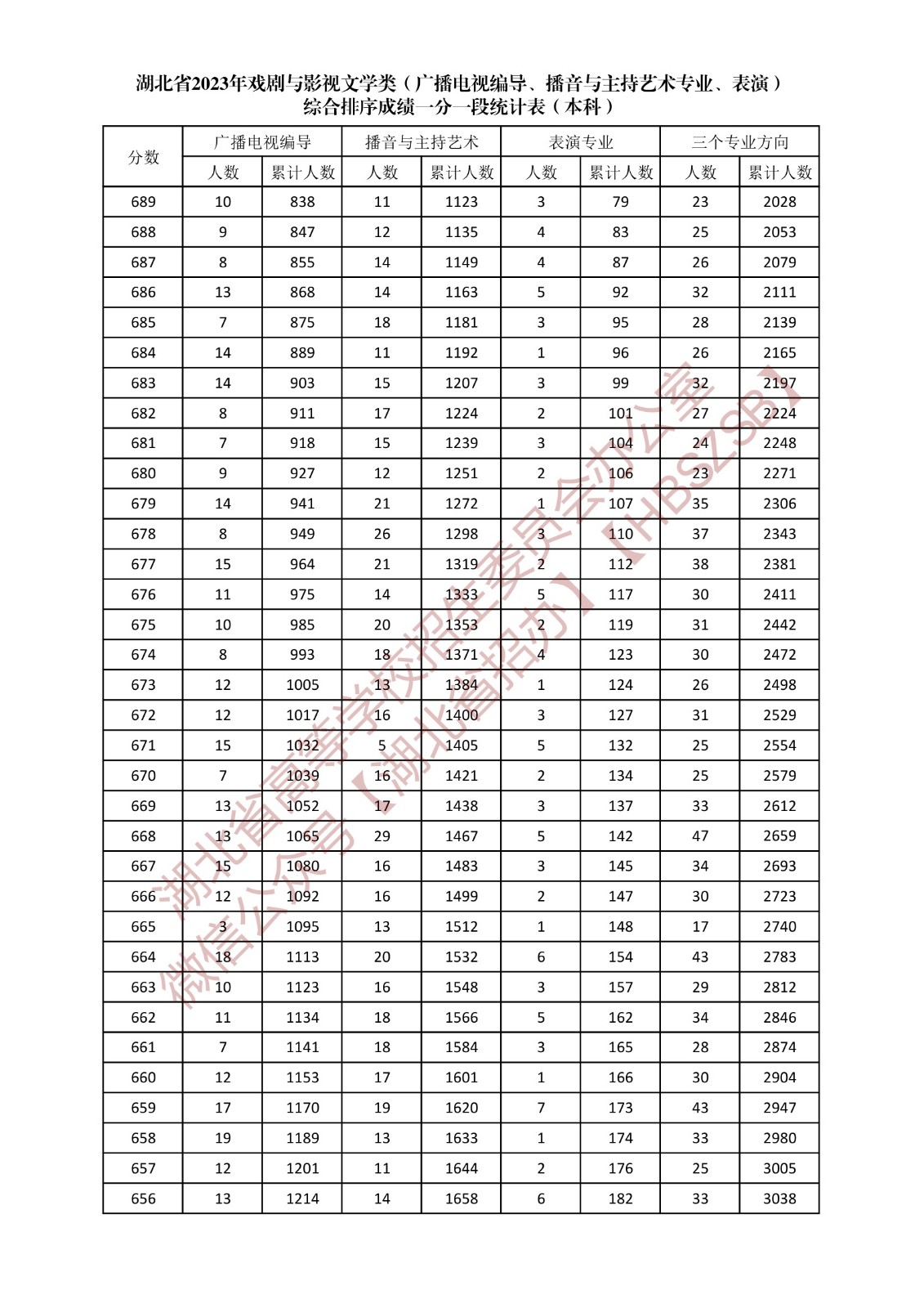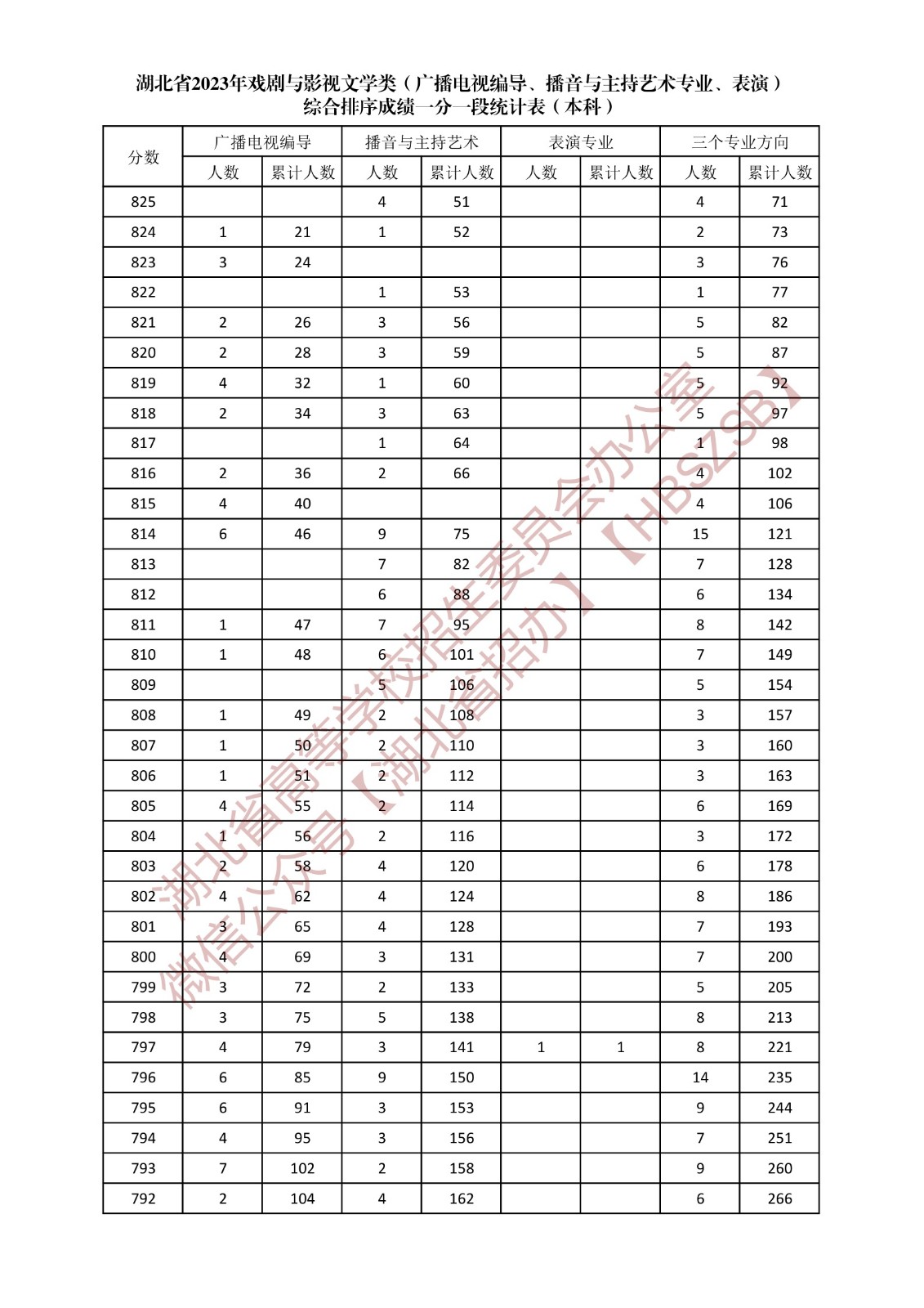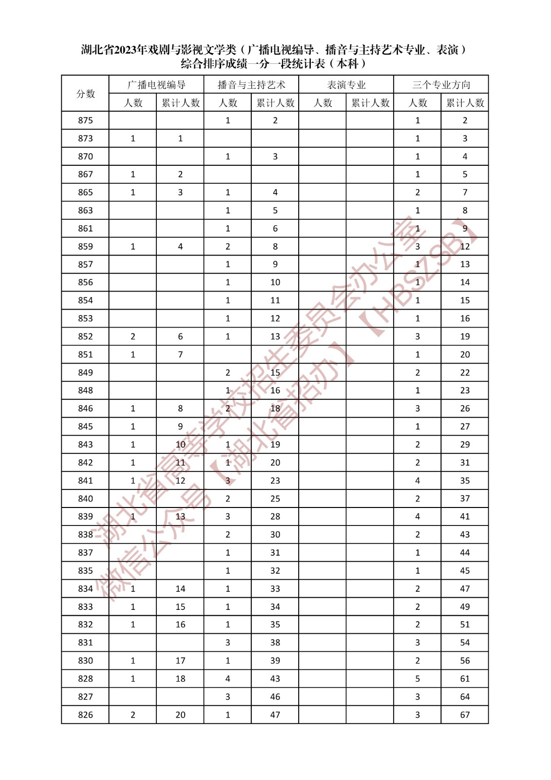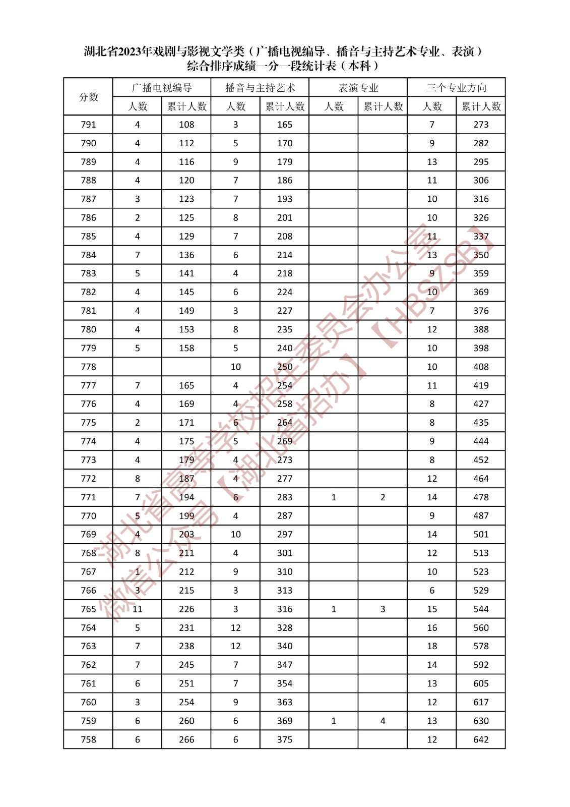 湖北省2023年戲劇與影視文學類(廣播電視編導、播音與主持藝術專業(yè)、表演)綜合排序成績一分一段統(tǒng)計表(本科)