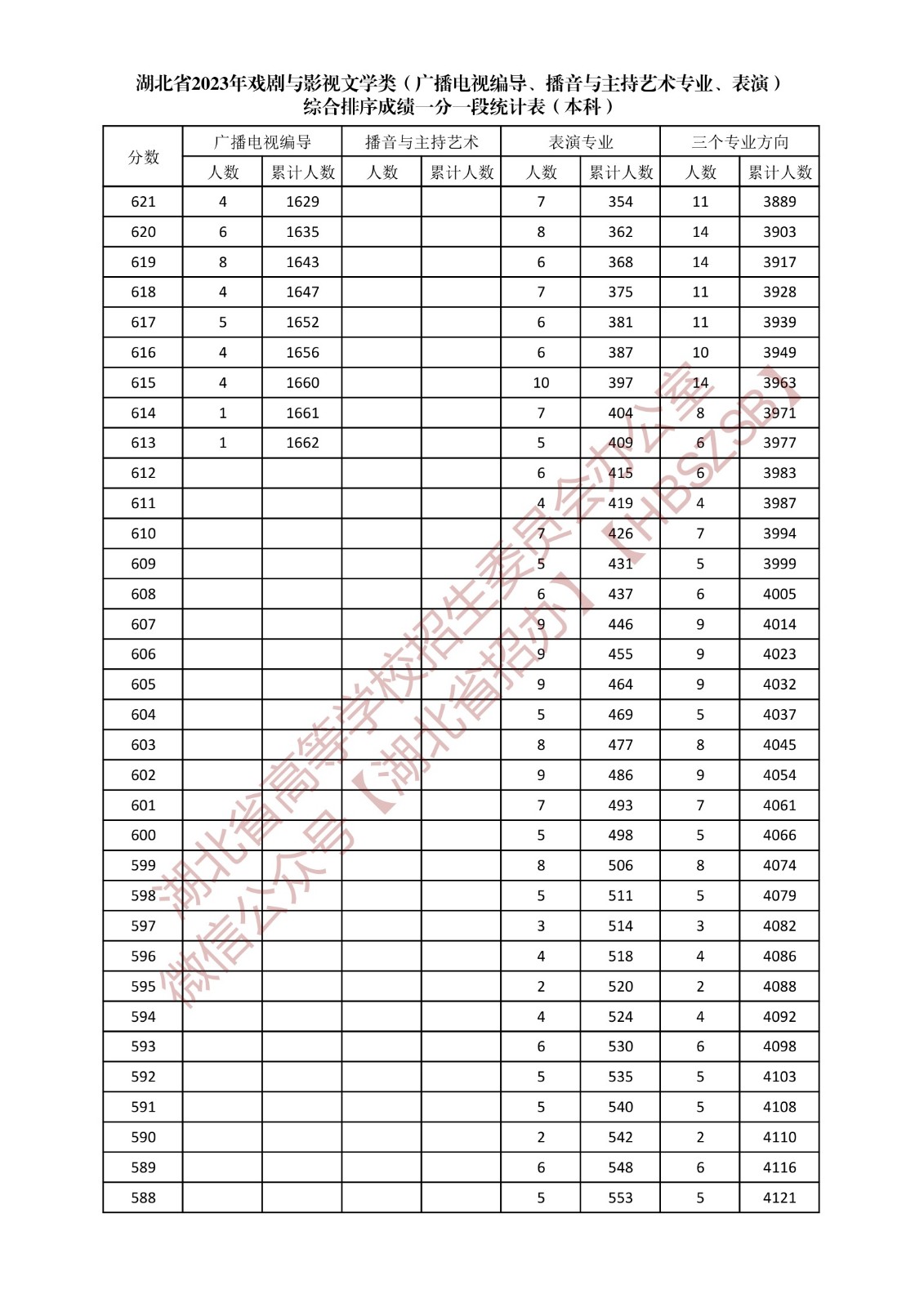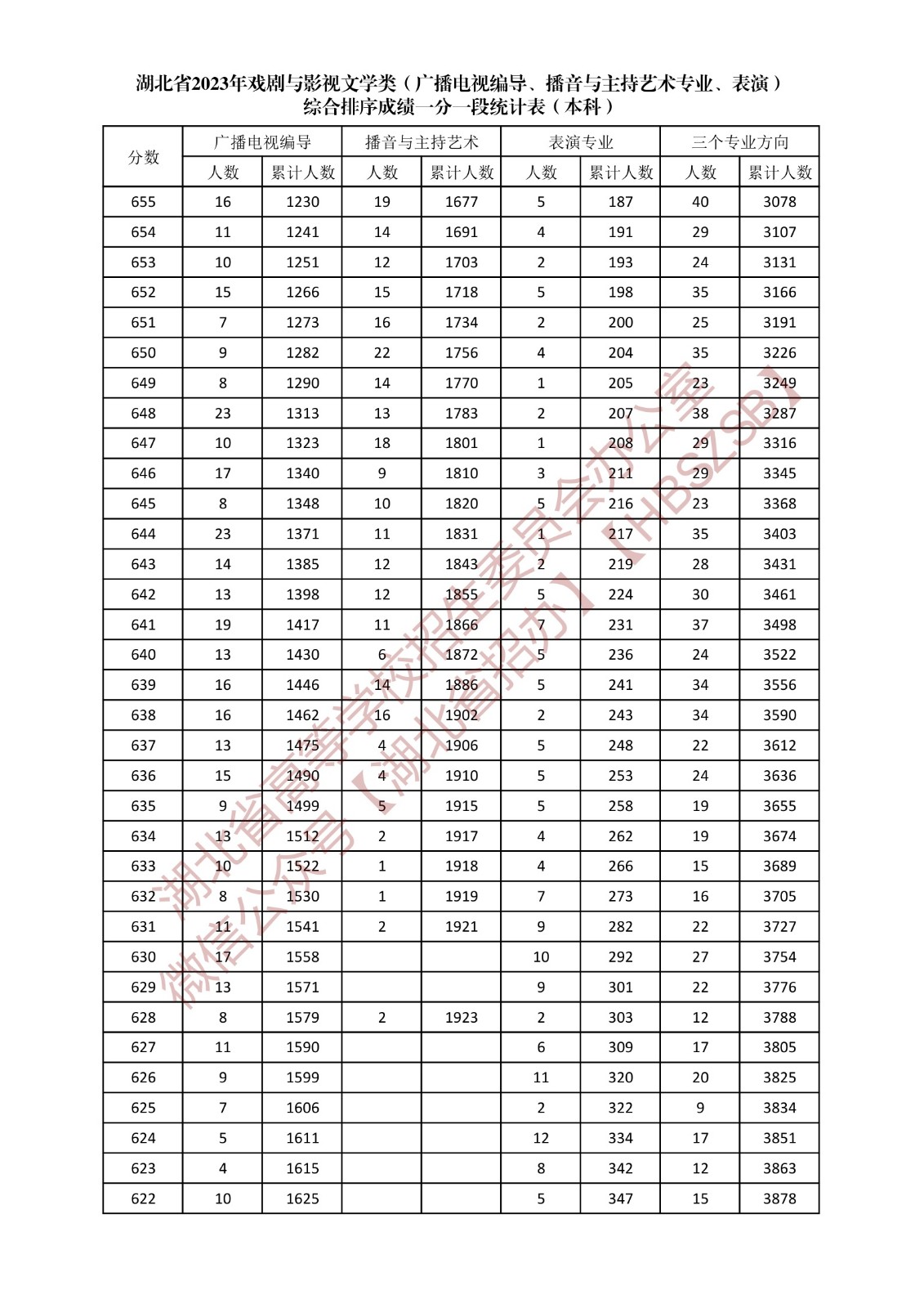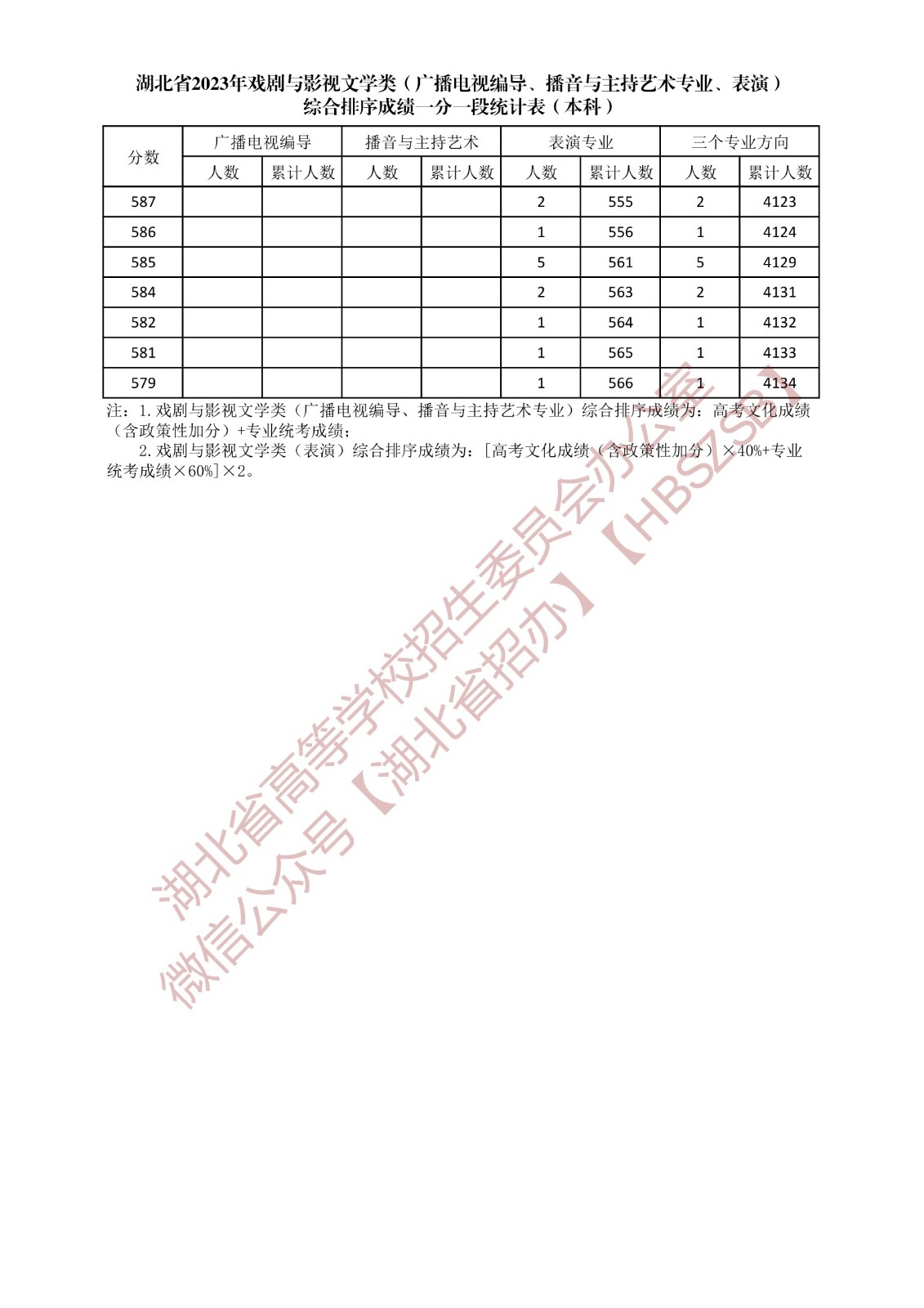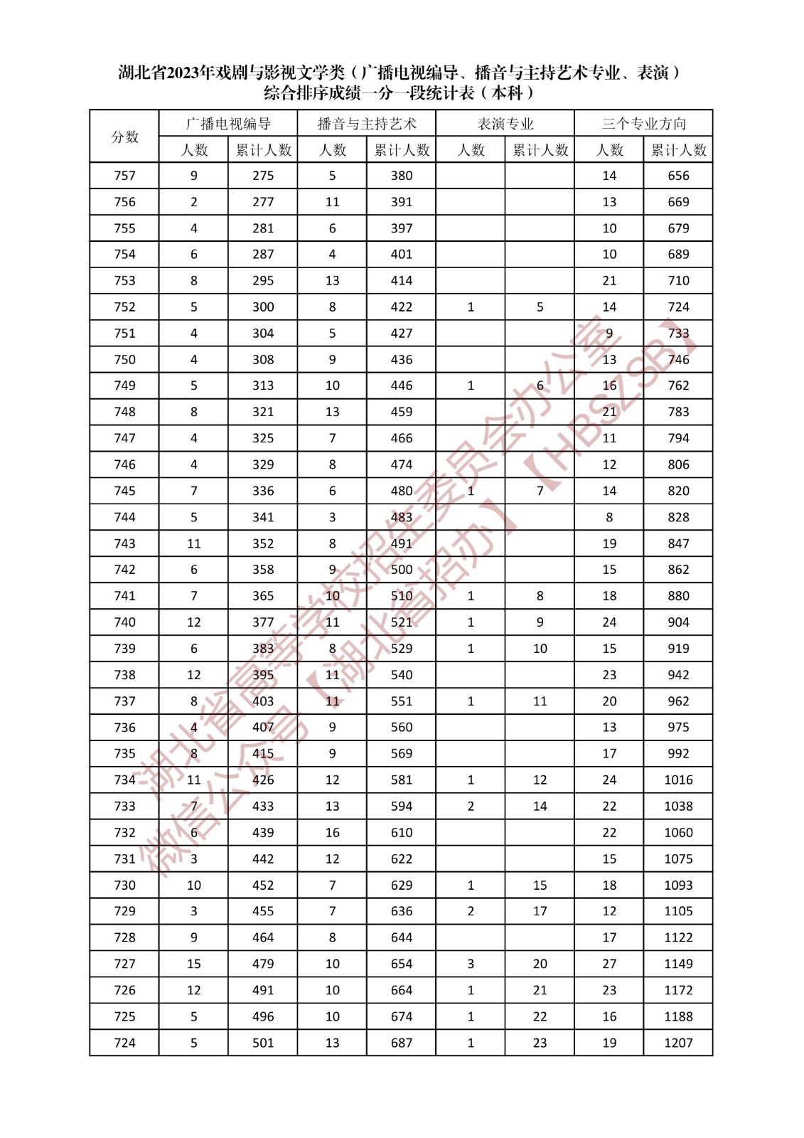 湖北省2023年戲劇與影視文學類(廣播電視編導、播音與主持藝術專業(yè)、表演)綜合排序成績一分一段統(tǒng)計表(本科)