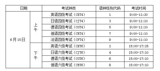 2024年上半年全國大學英語四、六級考試口試(以下稱CET-SET)和筆試(以下稱CET)將分別于5月18日至19日和6月15日舉行,其中CET-SET于5月18日開考英語四級,5月19日開考英語六級;CET于6月15日上午開考英語(日語、德語、俄語、法語)四級,下午開考英語(日語、德語、俄語)六級。現將我省報名有關事項通告如下: