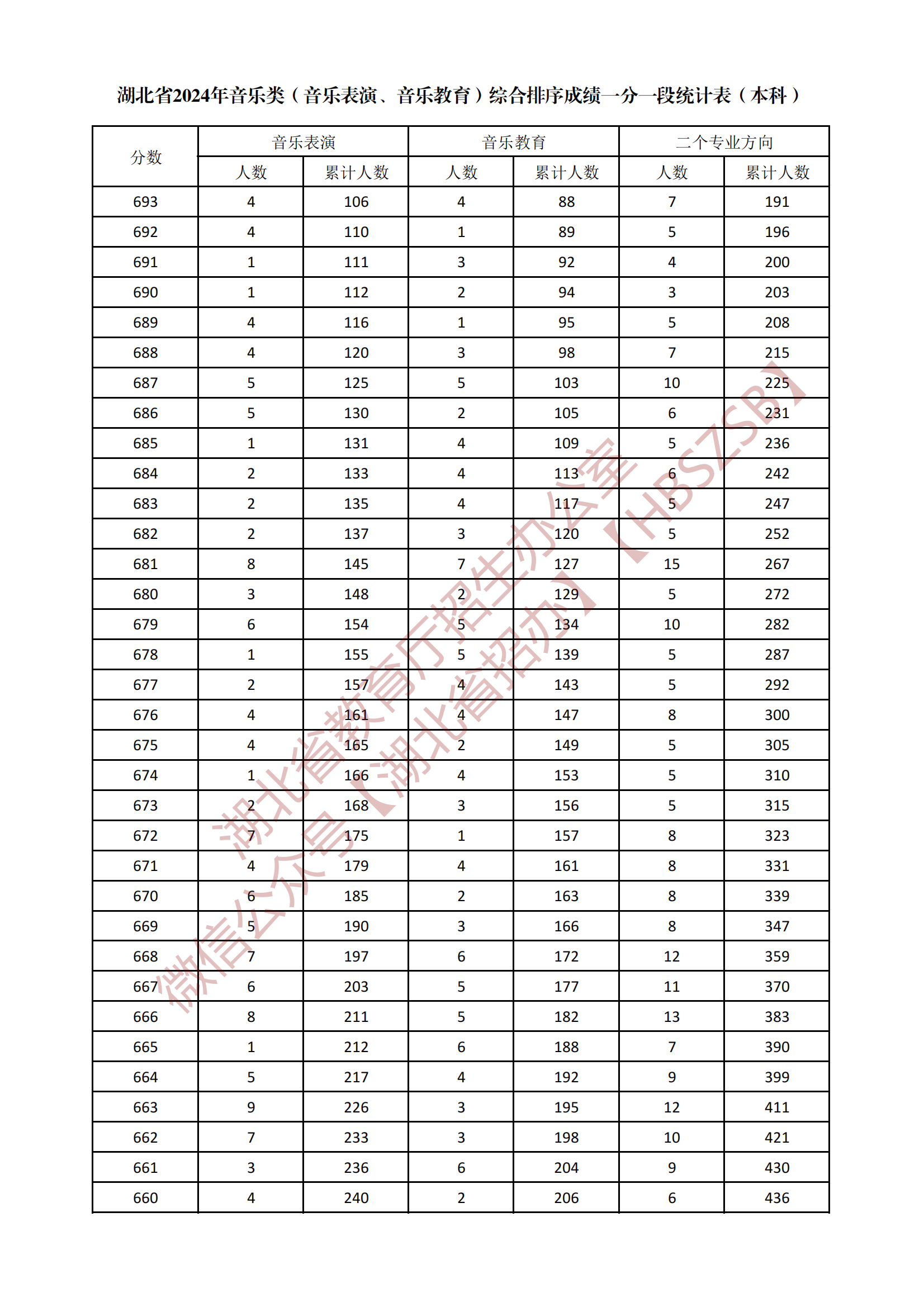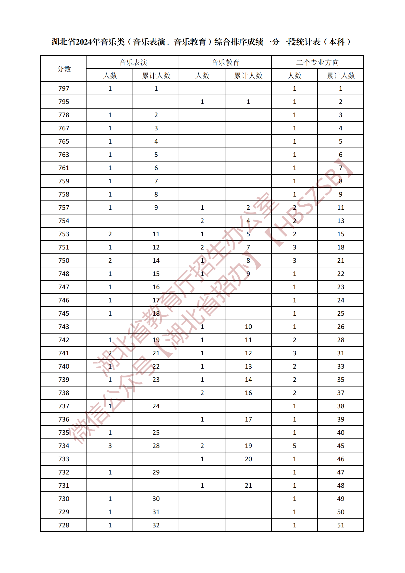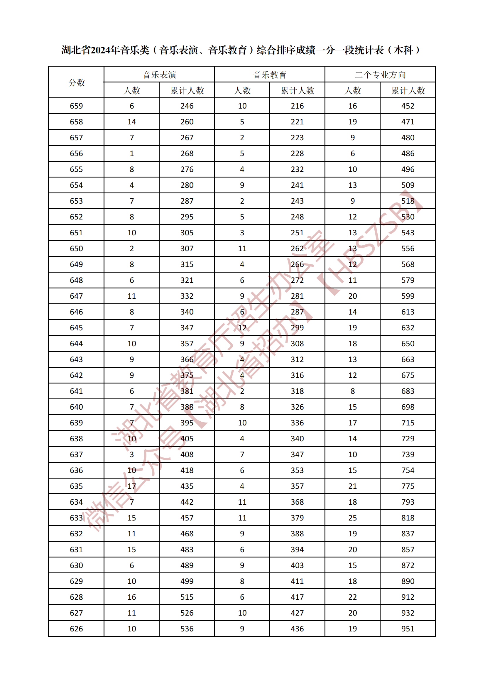 湖北省2024年音樂類(音樂表演、音樂教育)綜合排序成績一分一段統(tǒng)計表(本科)