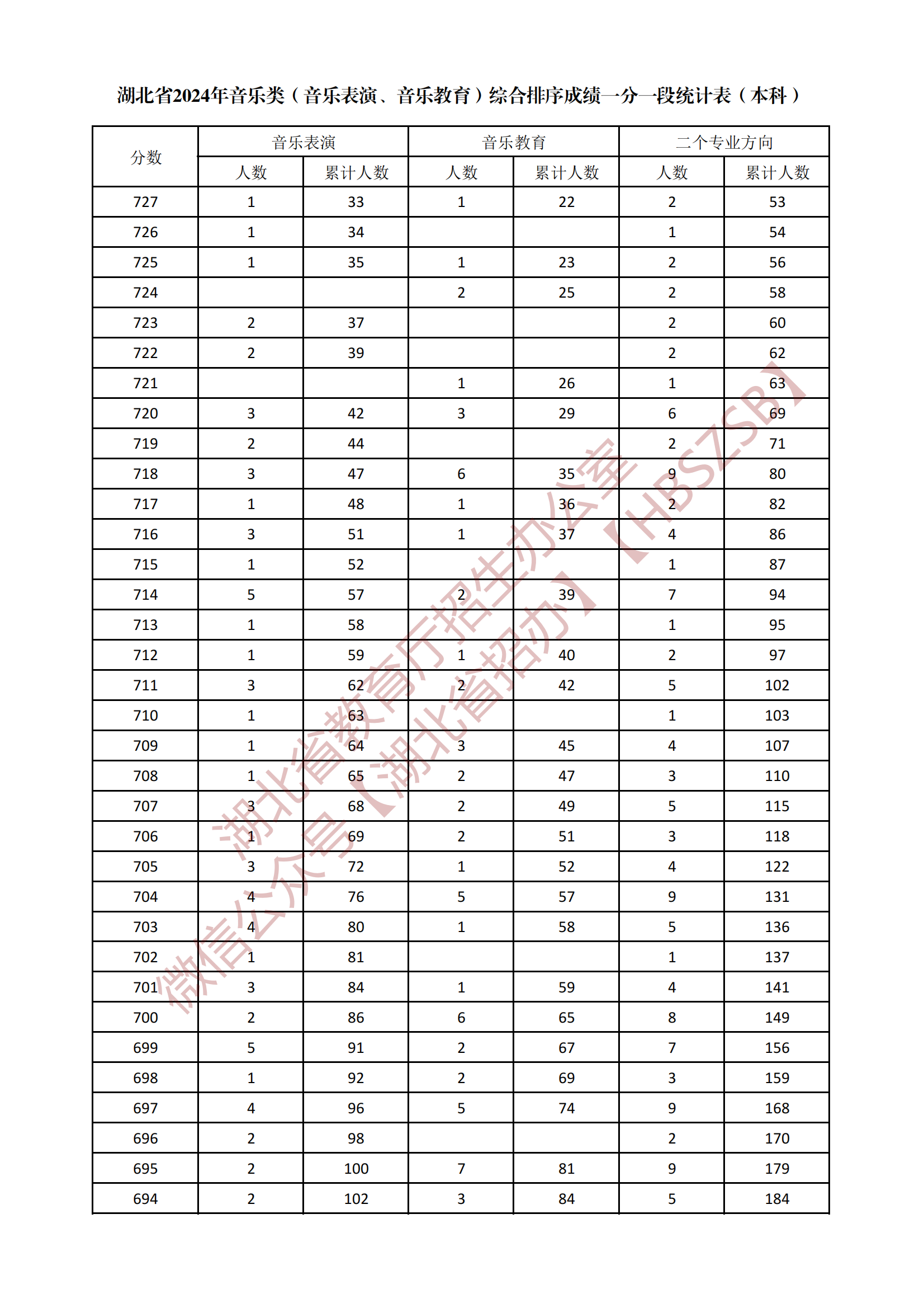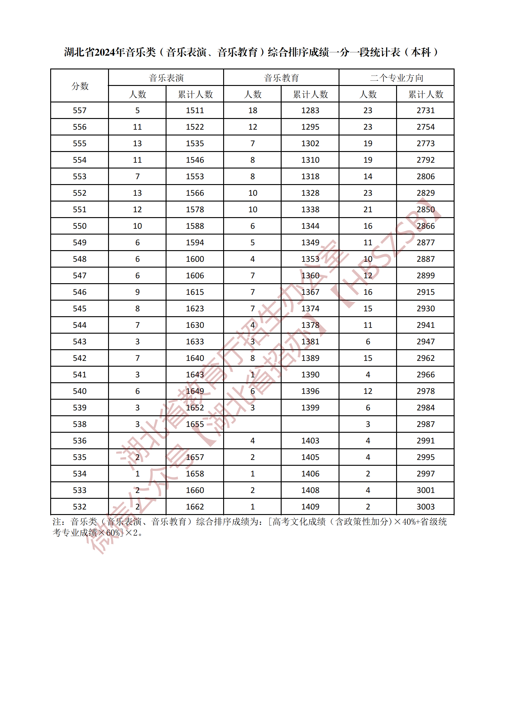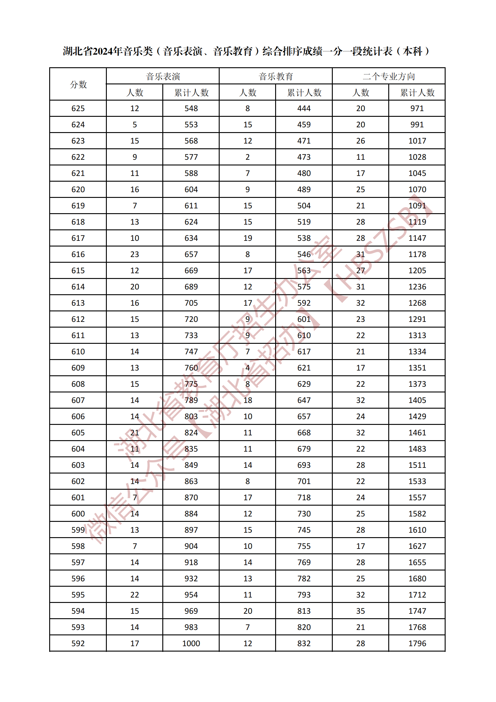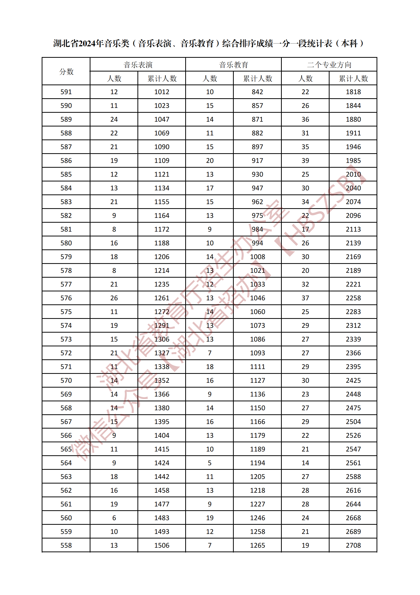湖北省2024年音樂類(音樂表演、音樂教育)綜合排序成績一分一段統(tǒng)計表(本科)
