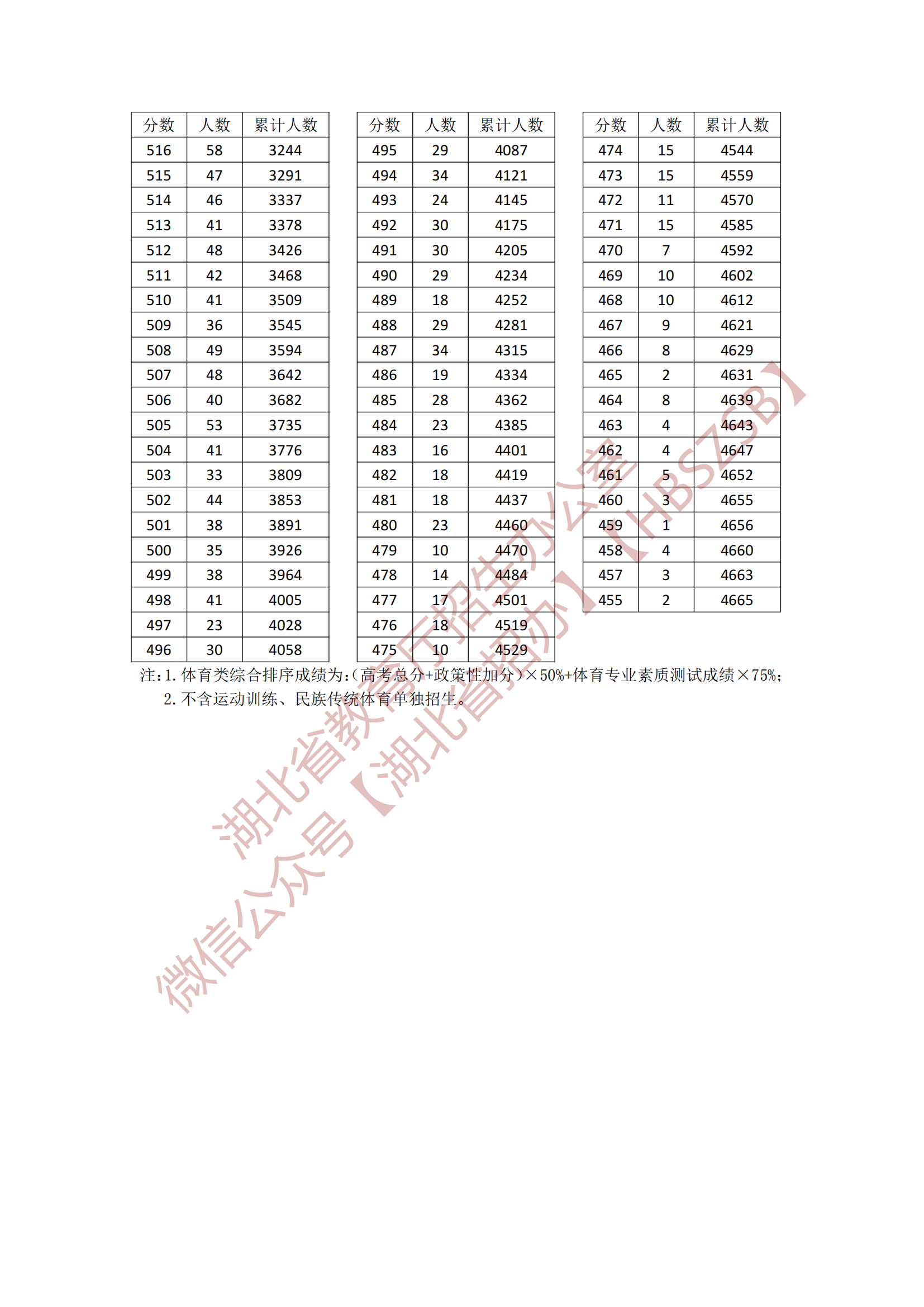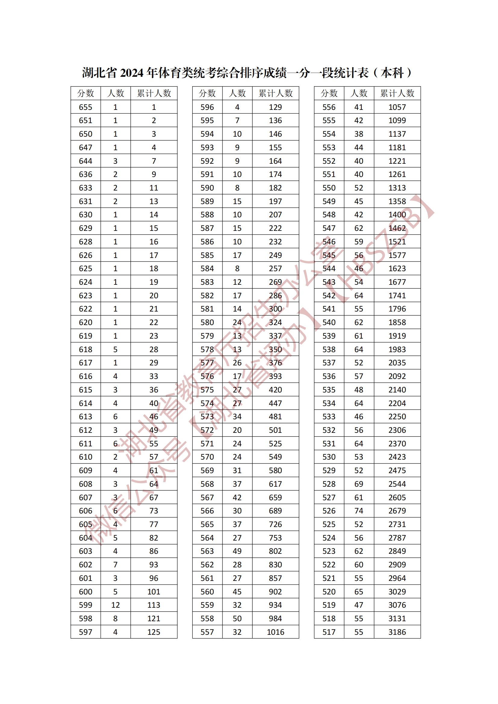 湖北省2024年體育類統(tǒng)考綜合排序成績(jī)一分一段統(tǒng)計(jì)表(本科)