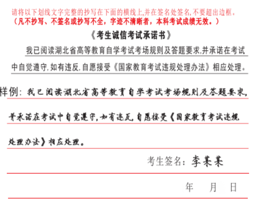 1.落實(shí)筆跡信息采集要求??忌鷳?yīng)在答題卡指定區(qū)域完整抄寫《考生誠信考試承諾書》(抄寫樣例如下圖),凡不抄寫、不簽名或抄寫不全,字跡不清晰者,該科考試成績無效??忌厴I(yè)時(shí),省教育考試院將對每張答題卡上的《考生誠信考試承諾書》筆跡進(jìn)行復(fù)核,凡筆跡不一致、經(jīng)鑒定為代考的,將根據(jù)《國家教育考試違規(guī)處理辦法》作出成績作廢、延遲畢業(yè)、記入國家教育考試誠信檔案等處理。