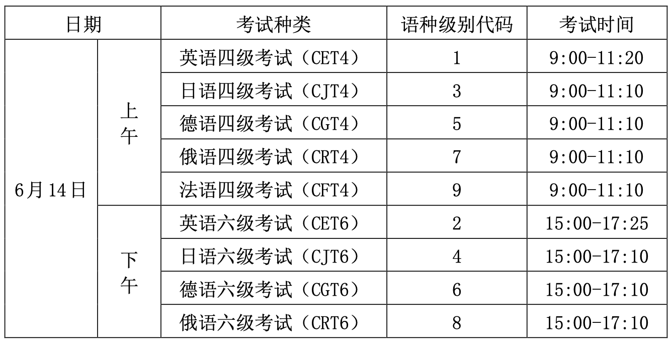 2025年上半年全國(guó)大學(xué)英語(yǔ)四、六級(jí)考試口試(以下稱CET-SET)和筆試(以下稱CET)將分別于5月24日至25日和6月14日舉行。其中,CET-SET于5月24日開考英語(yǔ)四級(jí),5月25日開考英語(yǔ)六級(jí);CET于6月14日上午開考英語(yǔ)(日語(yǔ)、德語(yǔ)、俄語(yǔ)、法語(yǔ))四級(jí),下午開考英語(yǔ)(日語(yǔ)、德語(yǔ)、俄語(yǔ))六級(jí)。現(xiàn)將我省報(bào)名有關(guān)事項(xiàng)通告如下: